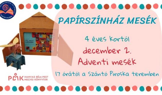 Decemberi mesedélutánunkon adventi, karácsonyi papírszínház mesékkel és kapcsolódó kézműveskedéssel várjuk a családokat.