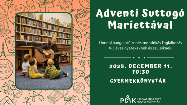 Dátum 2025. 12. 11. - 10:30 Balázs Marietta zenepedagógus várja a kisgyermekes családokat ünnepi hangulatú zenés-mondókás foglalkozására.A foglalkozáshoz könyvajánló is kapcsolódik.Ajánlott korosztály: 0-3 évesek és szüleikIdőpnt: 2025.12.11. 10:30Helyszín: gyermekkönyvtár