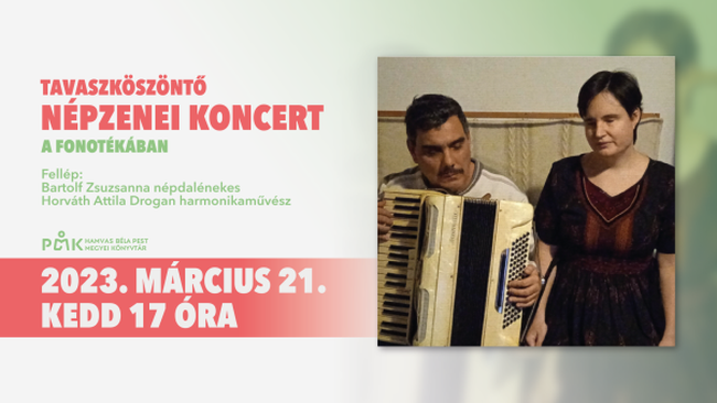 A március 21-én rendezett tavaszköszöntő népzenei koncerten Bartolf Zsuzsanna népdalénekes és Horváth Attila Drogan harmonikaművész volt a Fonotéka vendége.