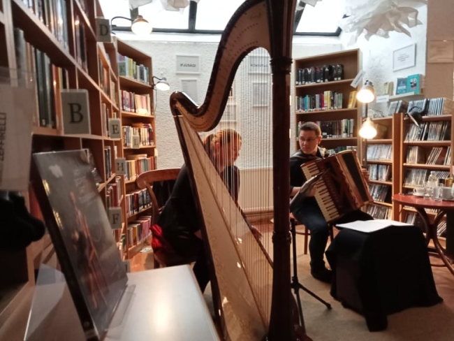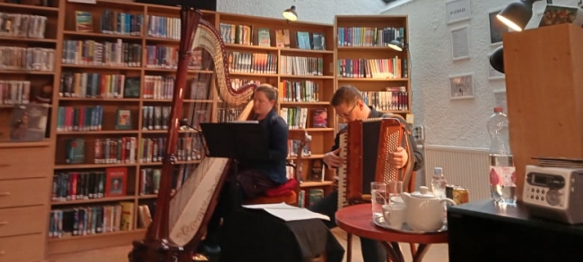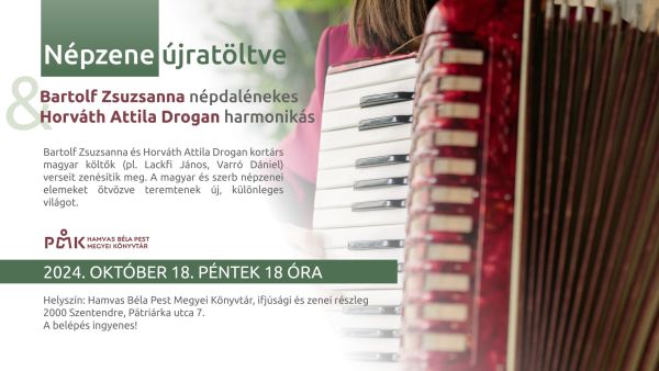 Bartolf Zsuzsanna népdalénekes és Horváth Attila Drogan harmonikás estjén vehettek rész az érdeklődők könyvtárunk ifjúsági és zenei részlegében október 18-án. Az előadók kortárs magyar költők (pl. Lackfi János, Varró Dániel) verseit zenésítették meg, a magyar és szerb népzenei elemeket ötvözve teremtettek új, különleges világot.